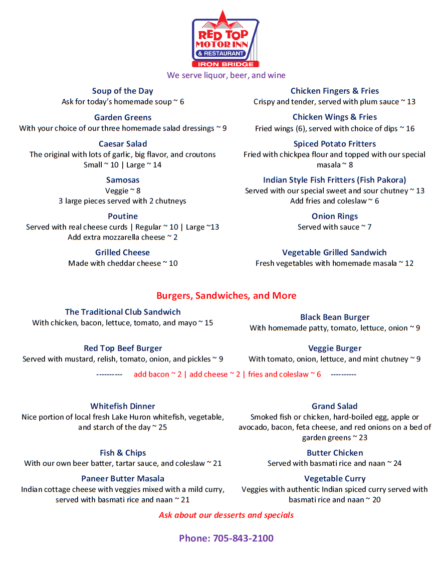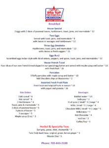 Our fresh market approach showcases fresh local products whenever possible. Every meal is made with care and love in our kitchen. In season, our vegetables come from the our local farmers. Our maple syrup is produced in a local St. Joesph Island farm. Our always fresh whitefish and smoked whitefish is caught right out of our Lake Huron shores. Our chicken and pork come from the local Amish and Mennonite farmers. Our Indian cuisine addition (butter chicken) has become a famous Hwy 17 must-have! And of course, we are trans-fat free. Freshness and dedication defines our approach and our restaurant ethic.