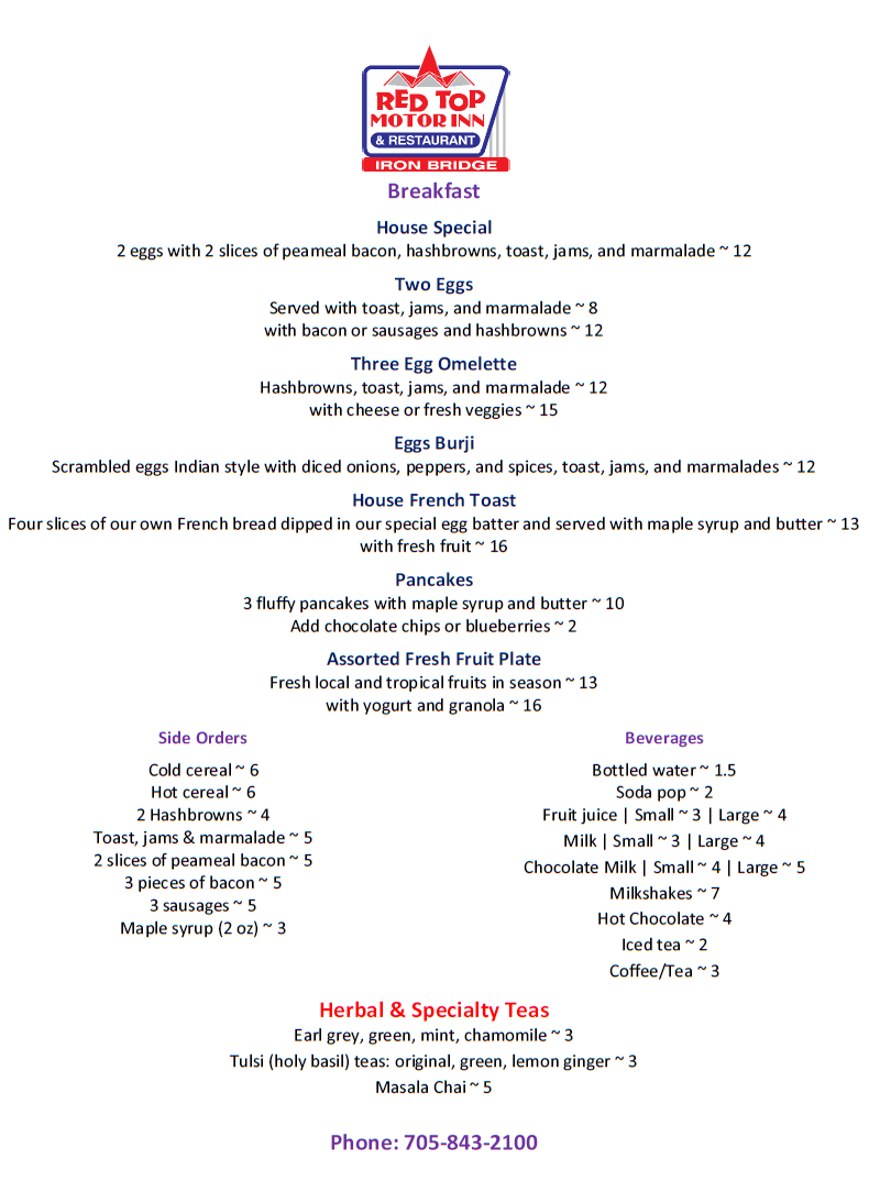 Dine in casual elegance at the Red Top Motor Inn Restaurant. Our informal modern bistro is open for breakfast, lunch and dinner 7 days a week. Our establishment is fully licenced under the L.C.B.O.