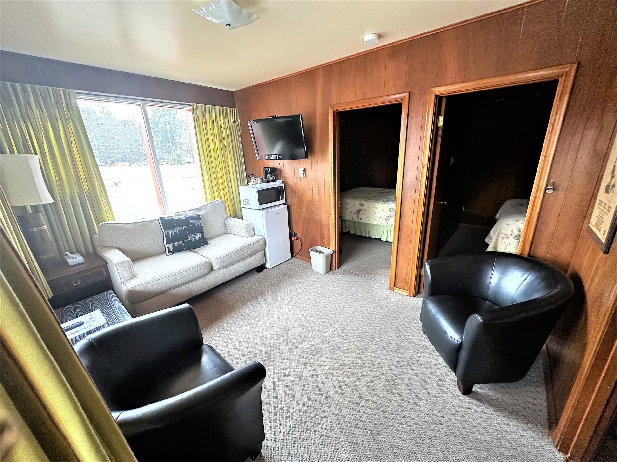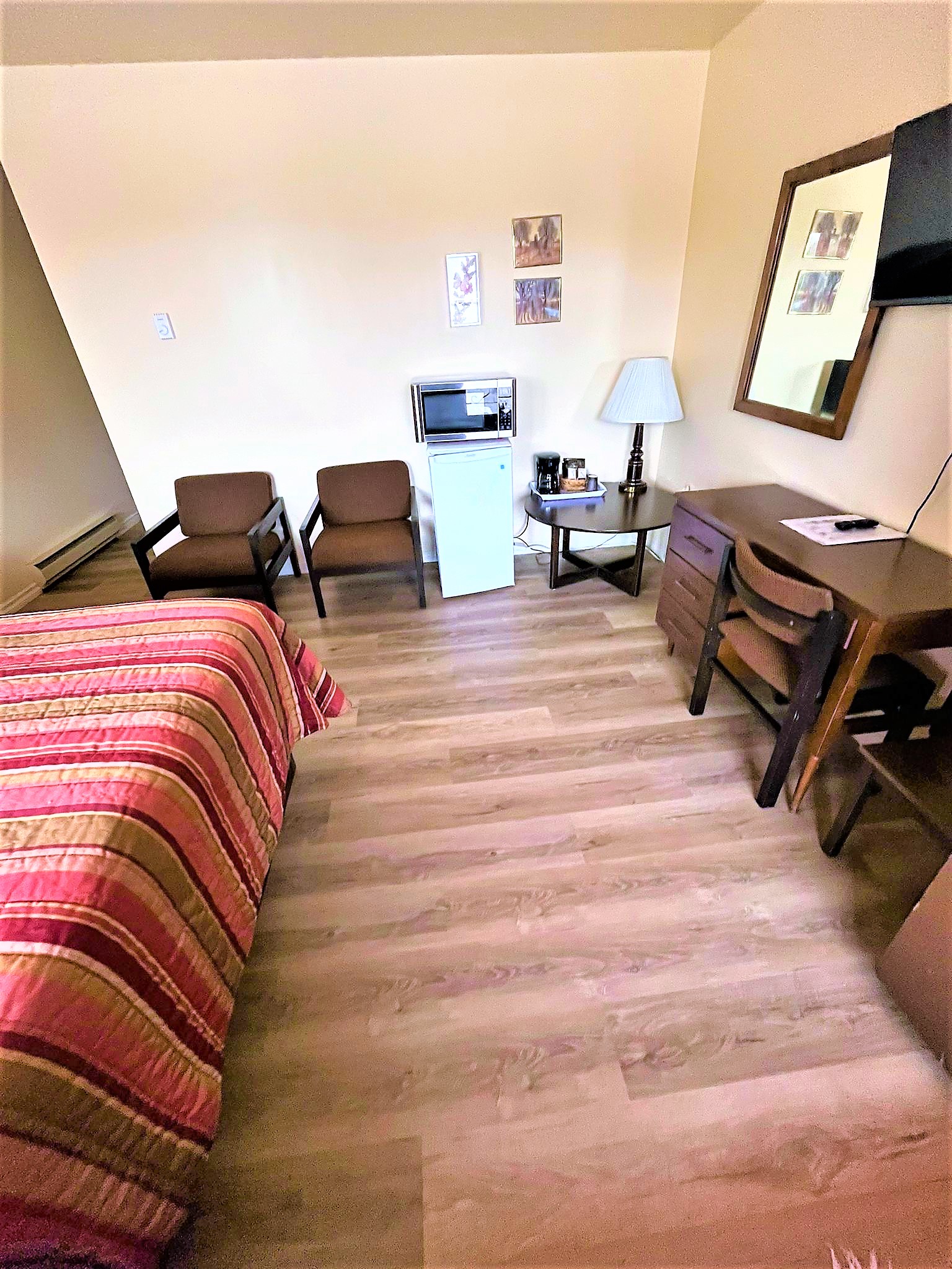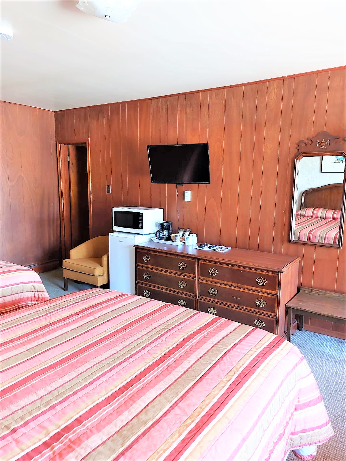 Our motel rooms are spacious, comfortable and immaculately clean with four-piece baths. Each room is equipped with a microwave and refrigerator. Enjoy our Smart TVs (including live channels and thousands of free movies and shows) along with free & fast Wi-Fi. You can park your car conveniently outside your door. All rooms have individually controlled electric heat and air conditioners. We are a non-smoking facility. Please notify us if you have a pet before booking.